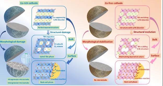 總體而言,該團(tuán)隊(duì)發(fā)現(xiàn)一系列形態(tài)和結(jié)構(gòu)降解機(jī)制,可以解釋為什么富鈷正極的容量隨著時(shí)間推移迅速衰減。這項(xiàng)研究對(duì)于設(shè)計(jì)高性能、低成本的無(wú)鈷電池具有重要的指導(dǎo)意義。在這些發(fā)現(xiàn)的基礎(chǔ)上,研究人員提出一系列無(wú)鈷正極材料,并驗(yàn)證這些材料具有良好的性能,將來(lái)有望應(yīng)用于可充電電池,并大規(guī)模投入商用。