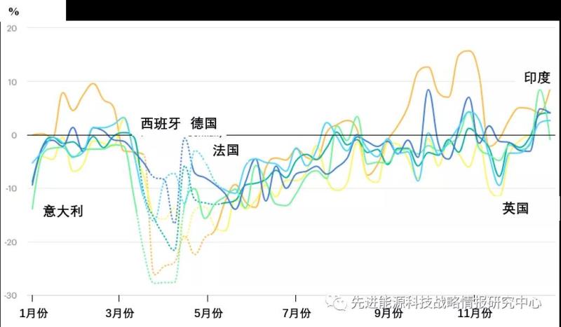 圖1 2020年部分國(guó)家每周電力需求(經(jīng)天氣修正)同比變化(單位:%)
