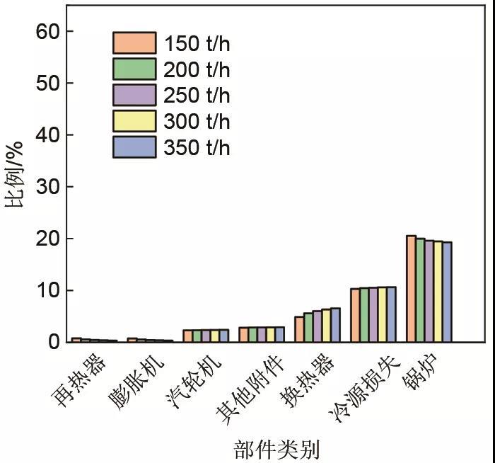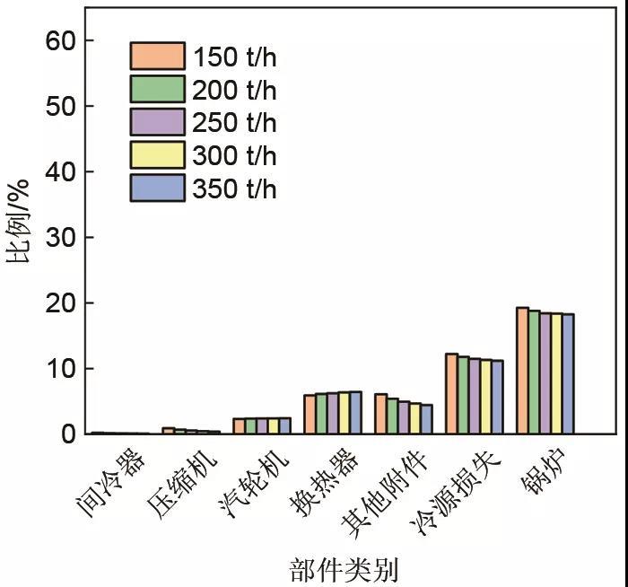 對比150、200、250、300、350 t/h抽汽量的集成系統(tǒng)強(qiáng)化供電階段基本點?分析,從圖16可以看出,各類部件?損失占輸入?的比例大小與強(qiáng)化供熱階段一致,鍋爐最大,冷源損失次之,分別為20%左右和10.5%左右。鍋爐的?損失最大,主要是由于燃燒損失以及換熱損失的不可逆性損失導(dǎo)致的。最小的是間熱器和膨脹機(jī)部件,均為0.5%左右。
