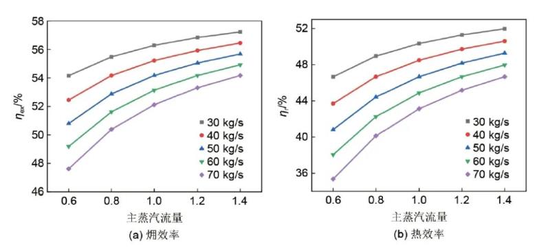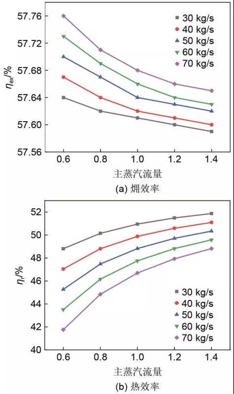 圖14 抽汽量不同時總過程?效率和熱效率變化規(guī)律