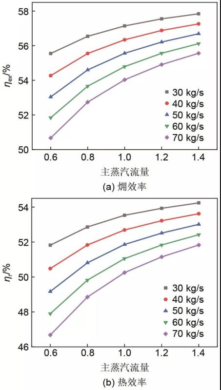 (2)隨著空氣流量從30 kg/s增大到70 kg/s,在強(qiáng)化供熱階段,熱電解耦指標(biāo)熱電比增大0.07~0.20左右;強(qiáng)化供電階段,熱電比減小0.14~0.28左右。隨著空氣流量的增大,在強(qiáng)化供熱和強(qiáng)化供電階段,熱電比隨主蒸汽流量的變化率均增大;對于某一特定的主蒸汽流量,集成系統(tǒng)性能隨空氣流量的變化規(guī)律,與基準(zhǔn)主蒸汽流量下的變化規(guī)律一致;