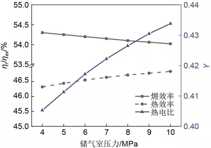 圖9為儲氣室壓力對集成系統(tǒng)熱效率、?效率和熱電比的影響,可以看出儲氣室壓力對各性能參數(shù)的影響較小。當(dāng)儲氣室壓力從4 MPa增大到10 MPa時,集成系統(tǒng)總過程的?效率降低0.3%,這是因為隨著儲氣室壓力增大,壓縮機(jī)耗功隨之增大,電能向熱能和壓力勢能轉(zhuǎn)換時的損失也略有增大,導(dǎo)致?效率呈現(xiàn)減小趨勢;而熱效率增大0.5%,是因為隨著壓縮機(jī)背壓的增大,壓縮機(jī)出口空氣溫度升高明顯,導(dǎo)致總系統(tǒng)向外輸出的熱能增大,但系統(tǒng)的輸入變化并不明顯,所以集成系統(tǒng)總過程的熱效率隨著儲氣室壓力的增大而增大;集成系統(tǒng)總過程熱電比增大0.03,隨著儲氣室壓力增大,能量轉(zhuǎn)換過程中的損失增大導(dǎo)致集成系統(tǒng)總過程的凈輸出電能逐漸減小,而強(qiáng)化供熱過程輸出的熱能逐漸增大,所以集成系統(tǒng)總過程的熱電比呈現(xiàn)增大趨勢。