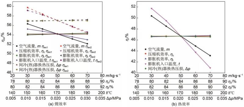 (1)強(qiáng)化供熱階段,壓縮空氣儲能系統(tǒng)的空氣流量對集成系統(tǒng)的熱效率/?效率影響最明顯,當(dāng)空氣流量從30 kg/s增加到70 kg/s時,熱效率和?效率均變化3%左右;強(qiáng)化供電階段,膨脹機(jī)入口空氣溫度的影響最大,當(dāng)入口溫度從150 ℃增加至190 ℃時,熱效率變化10%左右,?效率變化2%左右。壓縮空氣儲能系統(tǒng)的壓縮機(jī)/膨脹機(jī)效率以及換熱器性能對集成系統(tǒng)各效率影響均較?。?