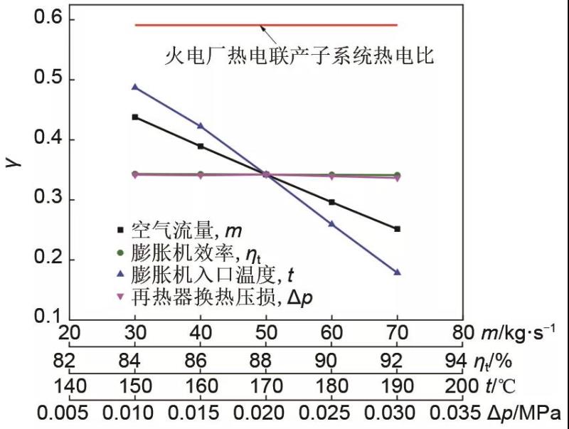 從圖7中可以看出,隨著進(jìn)入壓縮空氣儲能子系統(tǒng)壓縮機(jī)和膨脹機(jī)的空氣流量的增加,熱電比有所降低,這是由于集成系統(tǒng)強(qiáng)化供電階段隨著空氣流量的增加可以消耗掉更多熱電聯(lián)產(chǎn)機(jī)組的采暖抽汽,而與此同時膨脹機(jī)還產(chǎn)生更多的電能,最終導(dǎo)致熱電比隨著空氣流量的增加呈減小趨勢。隨著膨脹機(jī)效率從0.84增加到0.92的過程中,熱電比呈現(xiàn)降低趨勢,這是因為隨著膨脹機(jī)功率的升高,可以消耗掉更多的熱能和產(chǎn)生更多的電能,所以熱電比呈現(xiàn)減小趨勢。隨著膨脹機(jī)入口溫度和再熱器換熱壓損的增加,換熱損失有所增加,消耗的熱能有所增加,所以熱電比均呈現(xiàn)降低趨勢。