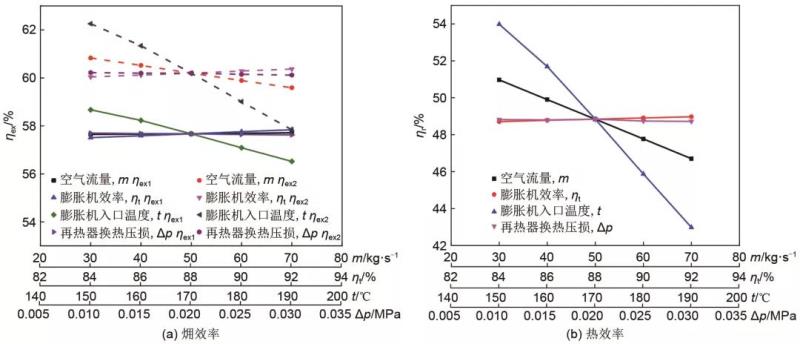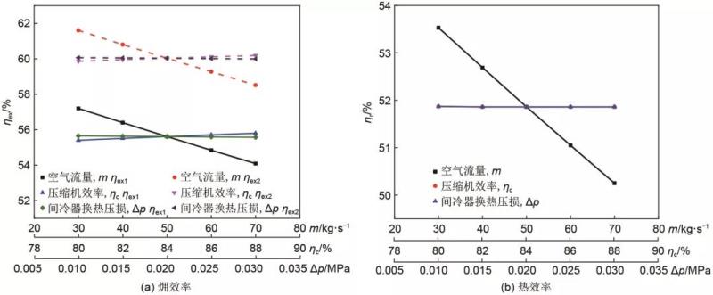 (3)總過程。從圖8中可以看出,由于換熱站換熱溫度不對等引起的換熱?損失,ηex1比ηex2小3%左右,采暖抽汽與用戶采暖溫度的差值會造成較大的能量損失。隨著進(jìn)入壓縮空氣儲能子系統(tǒng)壓縮機(jī)和膨脹機(jī)的空氣流量的增加,集成系統(tǒng)總過程的?效率呈現(xiàn)逐步減小的趨勢,當(dāng)空氣流量從30 kg/s增加到70 kg/s時,總過程的?效率從56.3%減小到52.2%;熱效率從50.4%減小至43.2%。這是因為隨著空氣流量的增加,有更多的電能完成從電能到熱能再到電能的轉(zhuǎn)化,即能量品位從高到低再到高,造成了能量的浪費(fèi),所以總過程?效率和熱效率呈現(xiàn)減小趨勢。當(dāng)壓縮空氣儲能子系統(tǒng)的壓縮機(jī)效率從0.82增加到0.90時,總過程?效率增加0.4%;熱效率幾乎不變。這是由于當(dāng)壓縮機(jī)效率提高時,壓縮機(jī)的耗功會相應(yīng)降低,即高品位的電能向低品位的熱能轉(zhuǎn)化的量減少,從而導(dǎo)致總過程?效率增加。當(dāng)壓縮空氣儲能子系統(tǒng)的膨脹機(jī)效率從0.84增加到0.92時,總過程的?效率增加0.35%,熱效率增加0.2%。原因是膨脹機(jī)效率的提高,會有更多的熱能轉(zhuǎn)化為電能,能量品位得以提升,故總過程的?效率和熱效率呈現(xiàn)增加態(tài)勢。膨脹機(jī)入口溫度從150 ℃增加至190 ℃時,總過程?效率降低2.2%;當(dāng)改變間冷器和再熱器兩端的換熱壓損使其從0.01 MPa增加到0.03 MPa時,總過程?效率在54.2%左右,熱效率在46.6%左右;這是因為換熱損失隨之增加,但由于其影響較小,故總過程的?效率輕微減小,幾乎沒有影響。