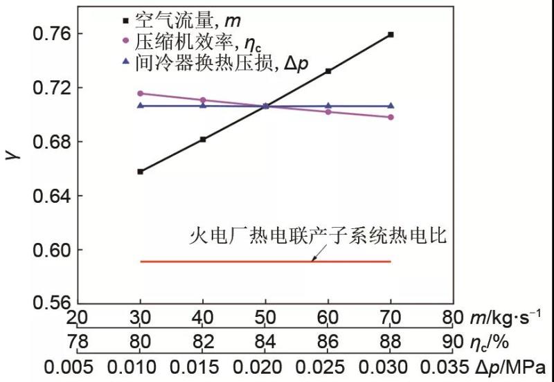 由圖5中可以看出,隨著進(jìn)入壓縮機(jī)和膨脹機(jī)的空氣流量的增加,集成系統(tǒng)強(qiáng)化供熱階段的熱電比逐漸增加,空氣流量從30 kg/s增加到70 kg/s時,熱電比從0.6578增長到0.7592;這是因為增大空氣流量時,產(chǎn)生的壓縮熱隨之增大,間冷器可以收集到的熱量增多,可向用戶提供的熱量也逐步增加,所以熱電比的變化逐步增加且增幅明顯。當(dāng)壓縮機(jī)效率從0.82向0.90增大時,集成系統(tǒng)強(qiáng)化供熱階段熱電比略有減小;原因是當(dāng)壓縮機(jī)效率升高時,產(chǎn)生的壓縮熱有所減小,可收集的提供給用戶的熱量減小,導(dǎo)致熱電比輕微降低。當(dāng)間冷器兩端的換熱壓損從0.01 MPa增加到0.03 MPa時,換熱損失有所增加,從而導(dǎo)致熱電比有輕微下降。
