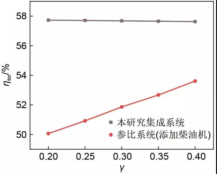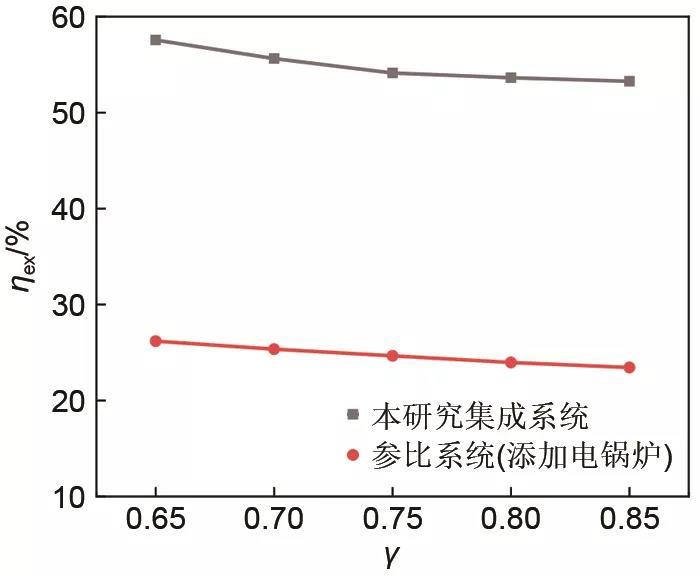 在計算壓縮空氣儲能子系統(tǒng)各部件參數(shù)對新型集成系統(tǒng)?效率的影響時,為對比由于換熱站換熱溫度不對等導(dǎo)致的換熱?損失大小,進(jìn)行了兩個不同?效率的計算,區(qū)別在于一個采用用戶側(cè)采暖供回水的?值差做為輸出熱負(fù)荷?值,取為ηex1;另一個采用采暖抽汽供回的?值差做為輸出熱負(fù)荷?值,取為ηex2。