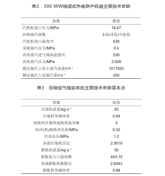 在搭建新型集成系統(tǒng)模型時,對于火電廠抽凝式熱電聯(lián)產(chǎn)機(jī)組和壓縮空氣儲能子系統(tǒng)的模型搭建,采取的主要技術(shù)參數(shù)見表2、表3。