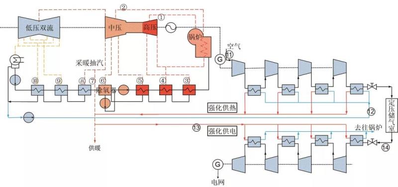本文提出一種熱電聯(lián)產(chǎn)機(jī)組與壓縮空氣儲能集成的新系統(tǒng),即在壓縮空氣儲能系統(tǒng)的基礎(chǔ)上,利用壓縮過程產(chǎn)生的壓縮熱來提供熱負(fù)荷,并引入熱電聯(lián)產(chǎn)機(jī)組汽輪機(jī)中壓缸末級采暖抽汽來加熱膨脹機(jī)入口空氣,以實現(xiàn)能源的高效利用。其中,熱電聯(lián)產(chǎn)機(jī)組采用中間再熱抽凝式機(jī)組,回?zé)岢槠墧?shù)采用三高三低一除氧;壓縮空氣儲能系統(tǒng)采用四級壓縮和四級膨脹,為定壓壓縮空氣儲能系統(tǒng)形式,利用水的靜壓實現(xiàn)儲氣室壓力的恒定。圖1為該新型熱電聯(lián)供系統(tǒng)流程。