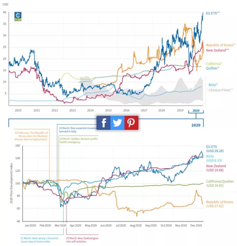 國際碳行動伙伴關(guān)系(ICAP)最新發(fā)布的《2021年全球排放交易狀況報告》認為,碳市場在疫情下表現(xiàn)出的韌性可能部分歸功于兩個因素。
