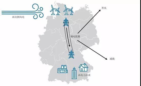最知名的因電網(wǎng)阻塞導(dǎo)致VRE棄電的案例是德國(guó)電網(wǎng)的例子。德國(guó)三分之二的陸上風(fēng)電,和所有的海上風(fēng)電場(chǎng)都在德國(guó)的北部,但是工業(yè)用戶都位于南部。多年以來(lái),德國(guó)電網(wǎng)并沒(méi)有足夠的電網(wǎng)容量來(lái)將北部的風(fēng)電輸送到南部,因而阻塞經(jīng)常發(fā)生。這導(dǎo)致北部發(fā)生了風(fēng)電棄電,南部熱力發(fā)電廠的高污染和昂貴電力消費(fèi)還在攀升。這引起整體用能成本上升,見(jiàn)圖1。
