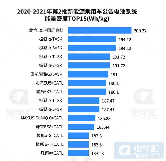 近期北汽不斷追求高能量密度電池系統(tǒng),全目錄能量密度前十名中除一款國機智駿車型外均為北汽旗下車型,且能量密度均在187Wh/kg以上,由寧德時代、SKI、國軒高科提供。