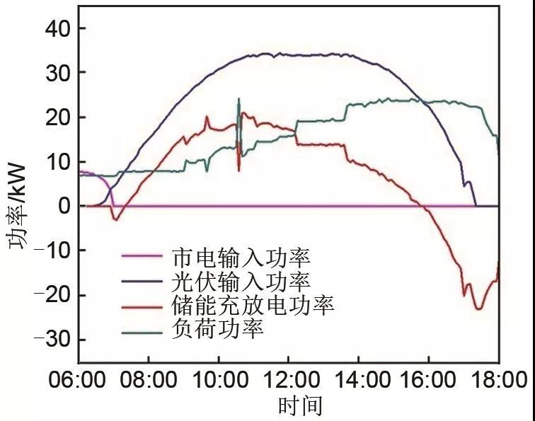 圖5所示為直流供電系統(tǒng)并網(wǎng)模式下某一天的功率運(yùn)行曲線,截取了涵蓋當(dāng)日光伏發(fā)電時(shí)間段的6:00—18:00數(shù)據(jù)。由圖可見(jiàn):按照控制策略,在前一天23:00至當(dāng)日7:00之間由市電給負(fù)荷供電,當(dāng)6:30左右光伏發(fā)電后,市電功率逐漸下降,7:00之后負(fù)荷功率完全由光伏和儲(chǔ)能提供;此后光伏出力始終大于負(fù)荷功率,多余電能儲(chǔ)存在電池中;16:00之后,光伏出力小于負(fù)荷功率,光伏不足部分由當(dāng)日儲(chǔ)存的電能提供,儲(chǔ)能持續(xù)供電,直至設(shè)定的SOC下限;當(dāng)日光伏發(fā)電充足,光伏發(fā)電能量大于負(fù)荷用電,在當(dāng)日7:00—18:00從電網(wǎng)“0”取電——恒定0功率;當(dāng)日在11:00左右,直流負(fù)荷功率有一次較大幅度的變化,儲(chǔ)能快速地進(jìn)行功率平衡,平抑負(fù)荷波動(dòng)。可見(jiàn)當(dāng)日光伏發(fā)電出力最大化并100%就地消納,平抑了光伏發(fā)電和負(fù)荷的功率波動(dòng),實(shí)現(xiàn)了能量的時(shí)移。