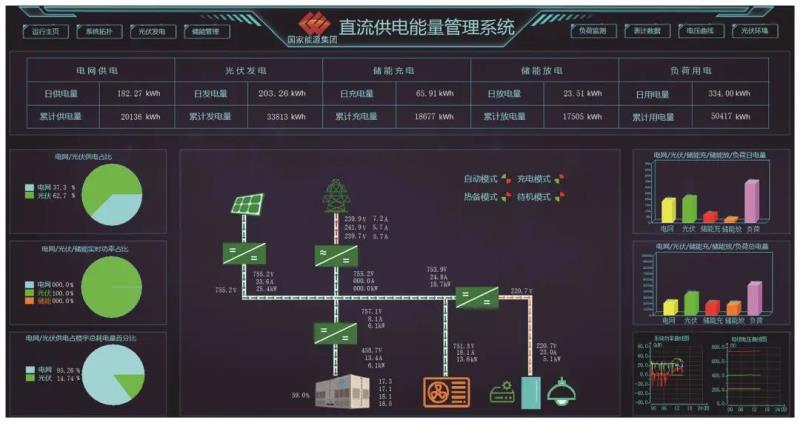 項(xiàng)目配備電能管理系統(tǒng),對(duì)直流電能和發(fā)用電設(shè)備進(jìn)行監(jiān)測(cè)、控制。主要完成監(jiān)測(cè)發(fā)用電設(shè)備運(yùn)行狀態(tài)、存儲(chǔ)和分析運(yùn)行數(shù)據(jù)、優(yōu)化調(diào)度電能等功能,實(shí)現(xiàn)光伏發(fā)電利用最大化,削峰填谷等目標(biāo)。直流供電能量管理系統(tǒng)運(yùn)行界面如圖4所示。