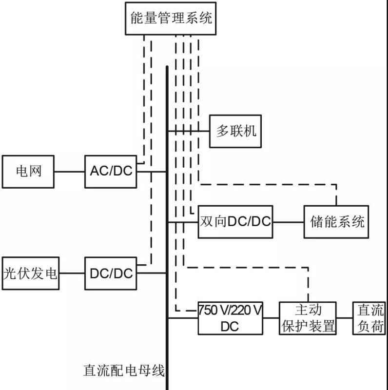 項(xiàng)目的低壓直流供電系統(tǒng)總負(fù)荷100 kW,采用兩級(jí)配電系統(tǒng),第一級(jí)配電為750 V單極母線,市電整流后接入母線,光伏系統(tǒng)通過(guò)光伏MPPT變換器接入,儲(chǔ)能蓄電池經(jīng)雙向變換器接入,該母線同時(shí)為多聯(lián)機(jī)等供電;第二級(jí)配電為單極220 V,為照明、電腦、云平臺(tái)服務(wù)器、家用電器等供電。