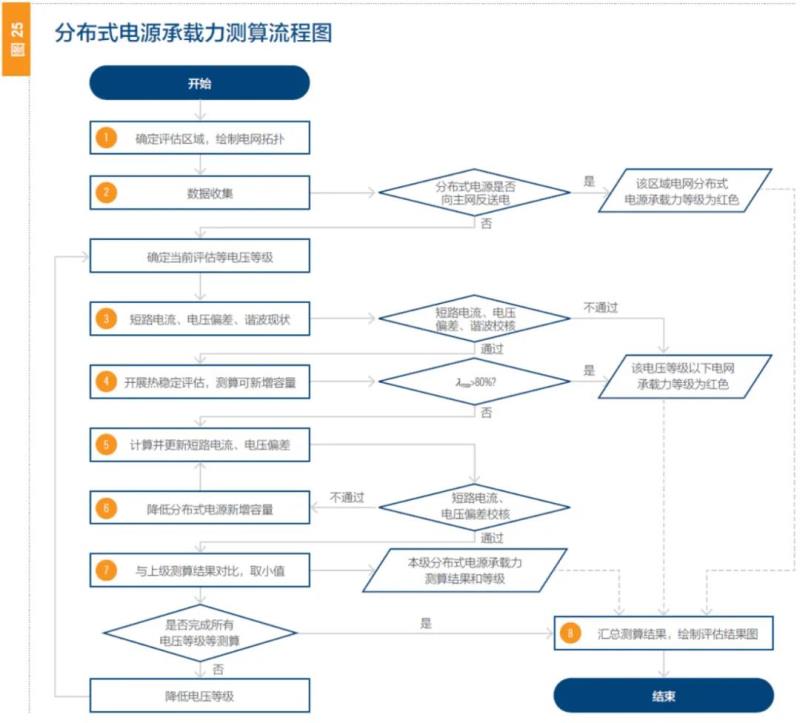分布式電源接入電網(wǎng)的承載力以待評估區(qū)域電源裝機(jī)信息、電源特性數(shù)據(jù)、電網(wǎng)設(shè)備參數(shù)、電網(wǎng)歷史運(yùn)行數(shù)據(jù)、電能質(zhì)量實(shí)測數(shù)據(jù)、電網(wǎng)安全運(yùn)行邊界數(shù)據(jù)等為基礎(chǔ)開展評估,并充分考慮該區(qū)域的地理位置、電網(wǎng)拓?fù)?、運(yùn)行方式、負(fù)荷類型、負(fù)荷水平、時(shí)間尺度、在建及已批復(fù)電源和電網(wǎng)項(xiàng)目等因素。評估流程(見圖25)如下: