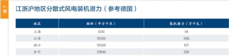 用德國的裝機(jī)密度來比照,也是國內(nèi)風(fēng)電行業(yè)較為常用的挖潛方法。這種方法盡管不是非常精確,但可以在一定程度上提供粗略的參考。德國國土面積為35.7萬平方千米,陸上風(fēng)電裝機(jī)5320萬千瓦,裝機(jī)密度約為149千瓦/平方千米,若簡單類比,按照德國裝機(jī)密度推算,江浙滬地區(qū)分散式風(fēng)電裝機(jī)潛力為3261萬千瓦(見表7)。