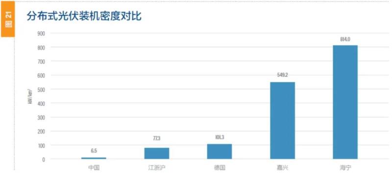 浙江是光伏制造大省,2012 年底省政府開始在嘉興開展光伏產(chǎn)業(yè)創(chuàng)新綜合試點(diǎn),嘉興市由此開始了分布式光伏發(fā)電的探索。 嘉興市下轄的海寧市是浙江省首批清潔能源示范縣,占地面積 700.5 平方千米。截至 2018 年底17,海寧分布式光伏裝機(jī)容量為 57 萬千瓦,占電網(wǎng)峰值負(fù)荷的 1/3,是本地電源的重要支撐;裝機(jī)密度達(dá)到 814 千瓦/平方千米(見圖 21),成為中國乃至全球分布式光伏發(fā)展的新樣板。