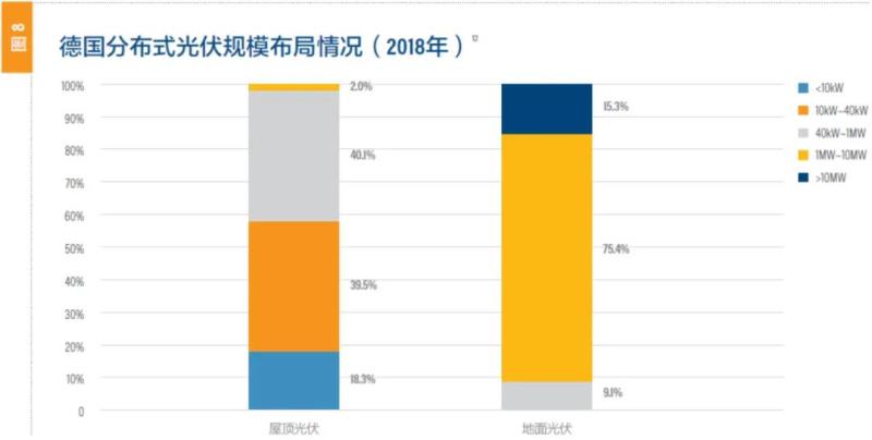 德國也是全球推廣分布式光伏發(fā)電最成功的國家之一。盡管光照資源條件并不好,年平均有效利用小時(shí)數(shù)僅800小時(shí)左右11。根據(jù)2018年的統(tǒng)計(jì)數(shù)據(jù),德國光伏裝機(jī)容量中,地面電站占28%,工商業(yè)屋頂光伏占58%,居民屋頂光伏占14%xiv。98%的屋頂光伏系統(tǒng)都是千瓦級(見圖8)。