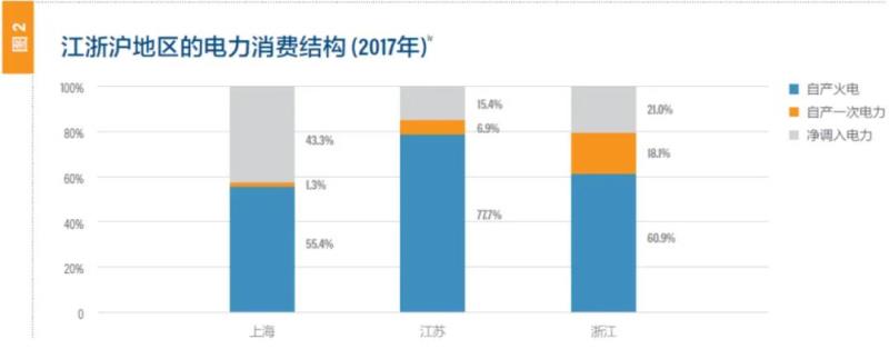從能源消費(fèi)結(jié)構(gòu)來看,江浙滬地區(qū)仍以化石能源為主,兩省一市的煤炭消耗量占能源消費(fèi)總量的比重仍在50%以上。2017年,火電在兩省一市電力裝機(jī)容量中占78.3%,核電占3.8%,水電、風(fēng)電和太陽能發(fā)電分別占6.3%、3.8%和7.8%iii。電力消費(fèi)以本地自產(chǎn)火電為主,自產(chǎn)一次電力(包括可再生電力和核電)除了浙江達(dá)到18.1%之外,江蘇和上海都不到10%。上海對外調(diào)電力的需求超過40%,江蘇和浙江的凈調(diào)入電力占比分別是15.4%和21.0%(見圖2)。