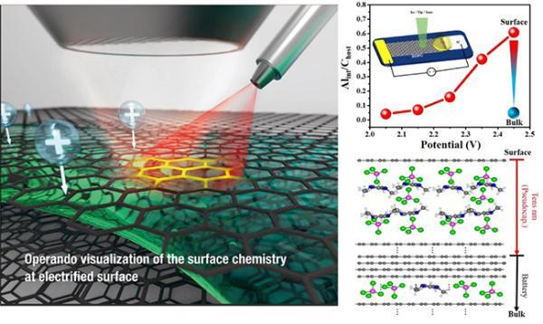 Langmuir、Ertl 等人建立起來的表面化學(xué)方法學(xué)能夠獲得固體表面結(jié)構(gòu)和化學(xué)信息,已在多相催化等領(lǐng)域中取得成功,但將這些技術(shù)應(yīng)用到電化學(xué)過程的原位表界面表征仍充滿挑戰(zhàn)。近年來,傅強(qiáng)團(tuán)隊(duì)探索利用表面化學(xué)方法學(xué)來研究電化學(xué)表界面問題。該工作中,研究人員通過長期探索,構(gòu)建出適合原位表面表征的模型電池,設(shè)計(jì)了一系列相關(guān)的原位樣品池和樣品臺(tái),實(shí)現(xiàn)了對鋁離子電池過程的多種在線表界面表征,包括 XPS、AFM、SKPM、Raman、掠角 XRD 等。研究發(fā)現(xiàn),充電過程中石墨電極表面區(qū)域陽離子(EMI+)與陰離子(AlCl4-)共插層嵌入到石墨層間,證實(shí)電極表面區(qū)域的插層離子超富集現(xiàn)象;基于電極過程的精準(zhǔn)在線測量,研究人員首次給出鋁離子電池電極反應(yīng)的定量描述,揭示儲(chǔ)能電極存在明顯的表面效應(yīng),利用該效應(yīng)構(gòu)建以超薄石墨為電極的電池器件實(shí)現(xiàn)了容量翻倍。