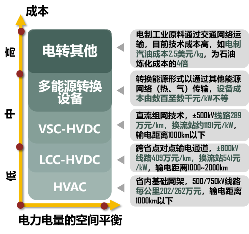 高比例可再生能源電力系統(tǒng)必然存在電力電量空間的不平衡。為此,需要通過電網的大范圍互聯(lián)與多能源形式之間的互濟轉化實現(xiàn)電力電量的空間平衡。具體描述如圖7所示。