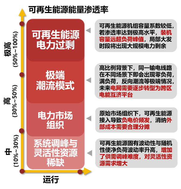 在運行時間尺度上,可再生能源帶來的一系列挑戰(zhàn)源自于其固有波動性與隨機性。風光可再生能源電源出力上限通常不可調度,系統(tǒng)調峰與電力市場組織問題,在中比例滲透階段的時候便會出現(xiàn),隨著滲透率的增加,問題逐漸凸顯。極端潮流模式與大發(fā)電力過剩的問題,在高比例與極高比例滲透階段才會出現(xiàn)。高比例可再生能源滲透對系統(tǒng)經濟安全運行的挑戰(zhàn)總結如圖3所示。