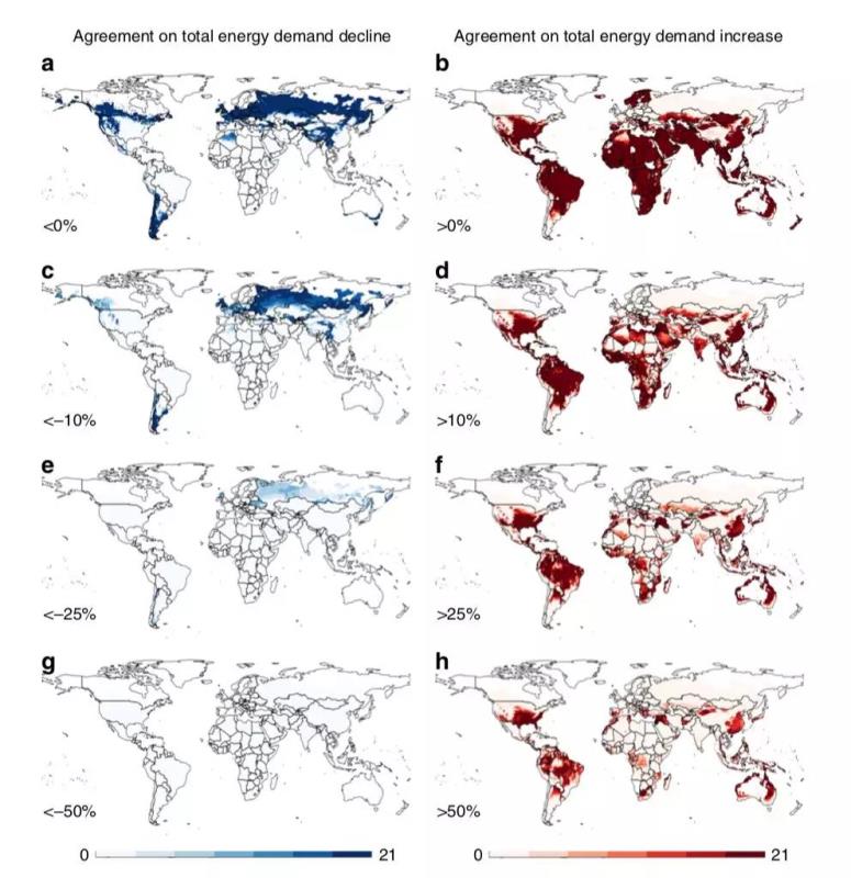 該研究使用計(jì)量經(jīng)濟(jì)的方法評(píng)估能源需求與人均收入、冷熱天數(shù)的響應(yīng),考慮2050年左右的平均氣溫的上升,推算出全球變暖使得全球能源需求在2050年左右增加了25-58%(在較溫和的溫升情況下也會(huì)增加11-27%),而能源需求由于社會(huì)經(jīng)濟(jì)、人口發(fā)展本身到2050年也將增長(zhǎng)1.7-2.8倍。在美國(guó),歐洲和中國(guó)的熱帶和南部地區(qū)的能源需求將因?yàn)闅夂蜃兣鲩L(zhǎng)超過(guò)25%。