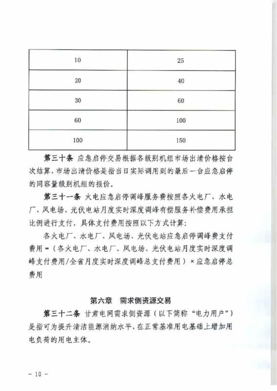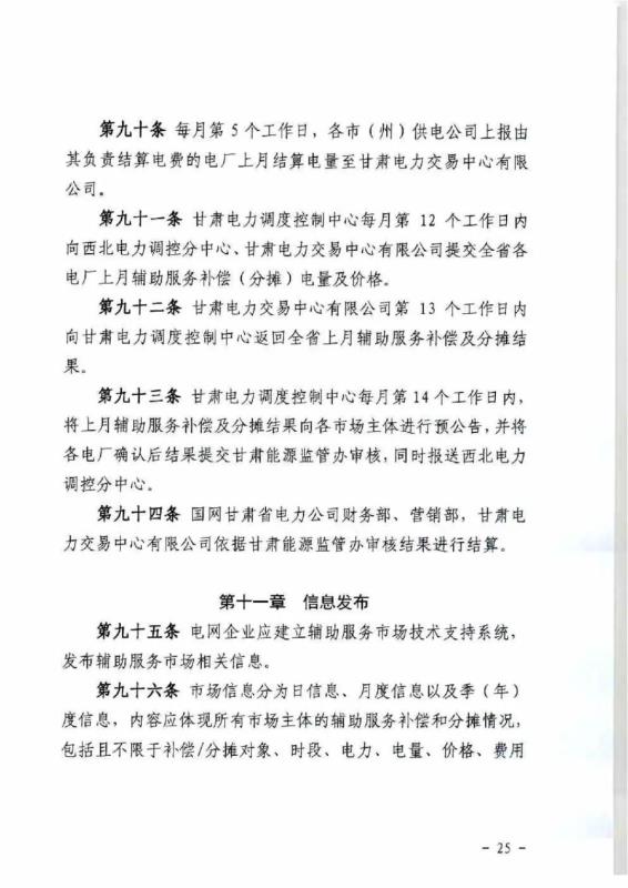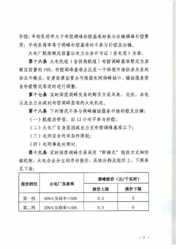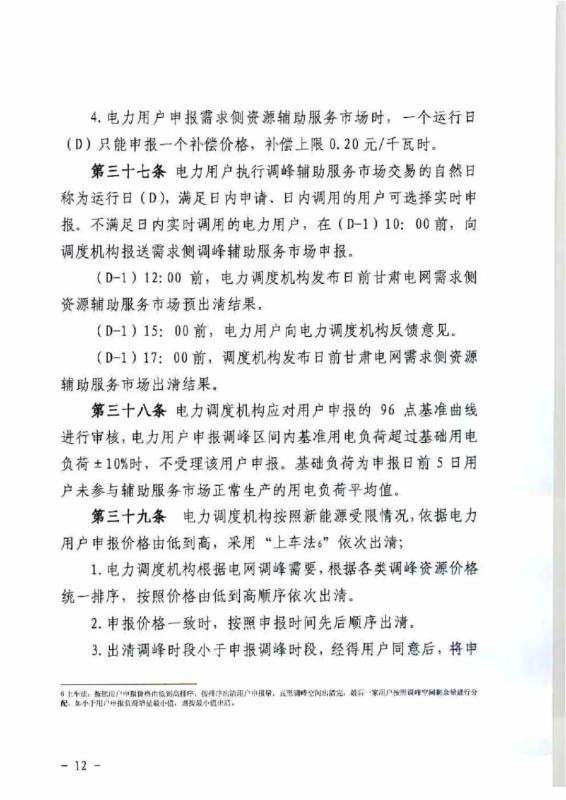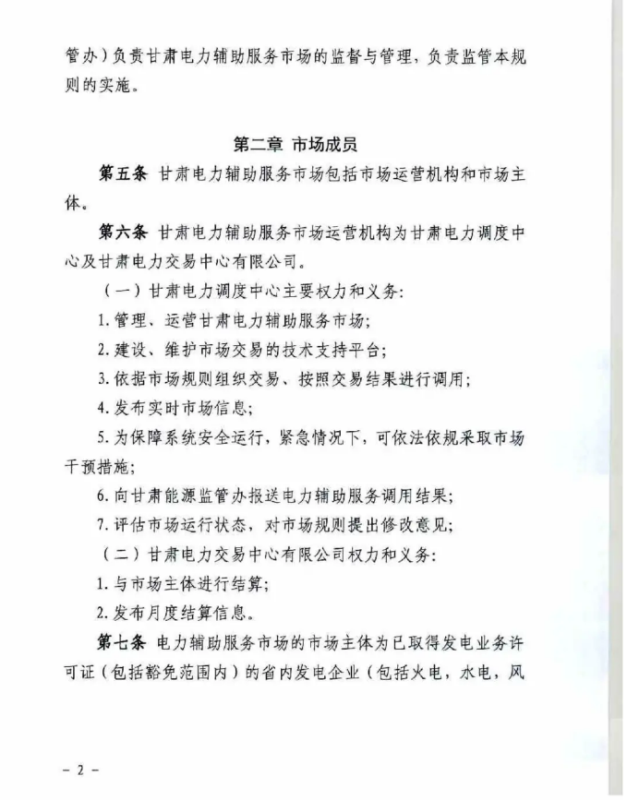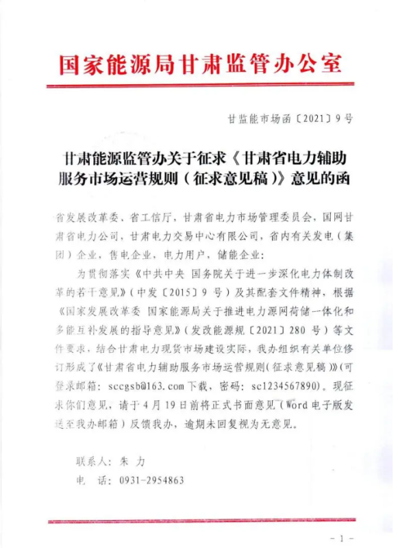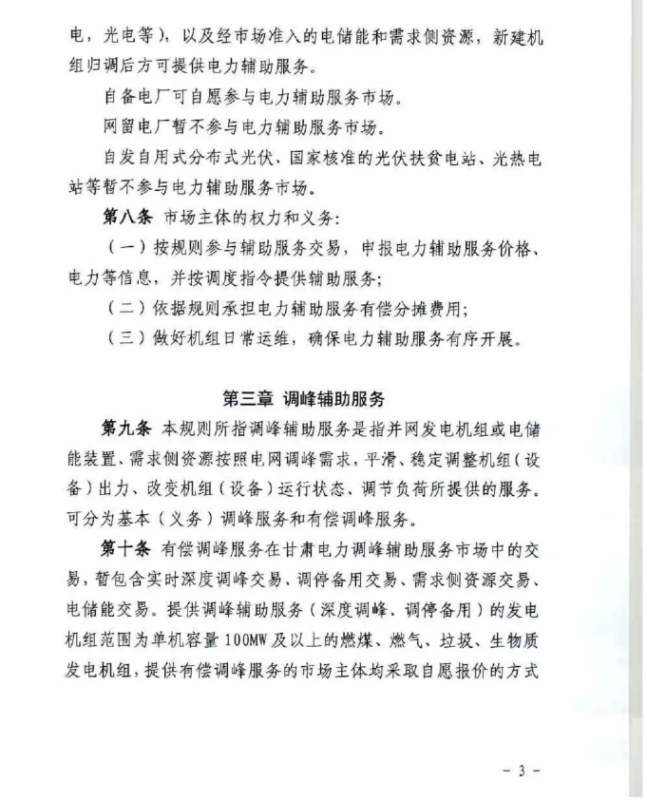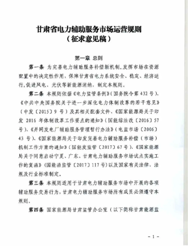 中國儲能網(wǎng)訊:4月10日,國家能源局甘肅監(jiān)管辦公室發(fā)布關(guān)于征求《甘肅省電力輔助服務(wù)市場運營規(guī)則(征求意見稿)》意見的函,意見稿規(guī)則較2019年發(fā)布的暫行補償價格有較大改變。調(diào)頻輔助服務(wù)補償價格由上限15元/MW下調(diào)至12元/MW。調(diào)峰輔助服務(wù)申報價格非現(xiàn)貨期間為0.5元/kWh,現(xiàn)貨期間為0.3元/kWh。