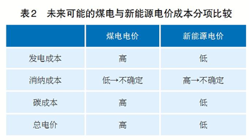 但是,我們也需要知道,在未來,這三類成本的高低比較可能發(fā)生變化。首先因為煤炭仍然是一種有限的資源,而風(fēng)、光等資源是取之不竭用之不盡的,煤電的發(fā)電成本將繼續(xù)高于新能源。而新能源的消納成本高低則取決于能源技術(shù)進步的速度與方向,以及在高比例可再生能源的條件下,傳統(tǒng)煤電的消納成本是否還可以保持在較低水平。對于新能源而言,技術(shù)進步的一個重要方向是實現(xiàn)從發(fā)電成本與消納成本之間由替代關(guān)系到互補關(guān)系的轉(zhuǎn)化。即發(fā)電成本下降的同時也能實現(xiàn)消納成本的有效下降,這是新能源價格較之煤電價格占優(yōu)的關(guān)鍵所在。當(dāng)然,技術(shù)進步也可能存在不確定性,但我們有信心相信在有效的技術(shù)進步的速度與方向下,以新能源為主體的新型電力系統(tǒng)中新能源電價較之煤電電價有優(yōu)勢(見表2)。