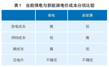 因此,綜合三個方面的成本,消費者面臨的電價=發(fā)電成本+消納成本+碳成本,當(dāng)前煤電與新能源的電價成本分項比較如表1所示??梢钥吹剑诋?dāng)前的成本結(jié)構(gòu)與成本比較下,難以簡單判斷新能源電價一定比煤電電價有優(yōu)勢。
