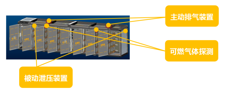 在電芯發(fā)生熱失控,主動(dòng)排氣系統(tǒng)失效的情況下,被動(dòng)防爆裝置會(huì)啟動(dòng),降低柜內(nèi)壓力,以保證消防人員安全