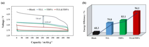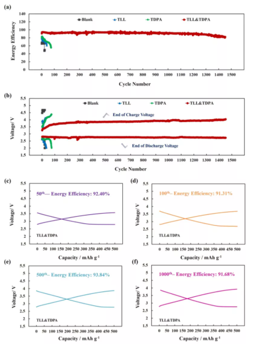 (a)能量效率;(b)充放電終止電壓;(c-f)TLL+TDPA電池的充放電曲線變化。