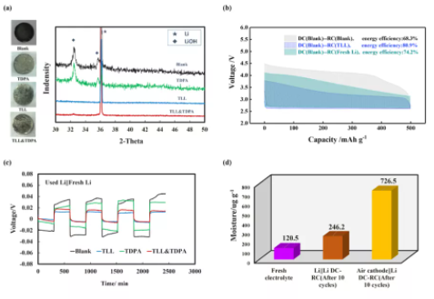 (a)循環(huán)10周后的金屬鋰負(fù)極照片和XRD圖譜;(b)替換鋰片、重新組裝后的鋰空氣電池充放電曲線;(c)循環(huán)后金屬鋰與新鮮鋰片組裝Li-Li對(duì)稱電池的充放電曲線;(d)模擬電池中的水含量對(duì)比。