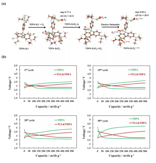 (a) Li+,O2-,LiO2和電子離域,neg為通過(guò)自然布居分析獲得的得電子數(shù);(b)TLL+TDPA電池和TDPA電池在第2,10,20和50周的充放電曲線。