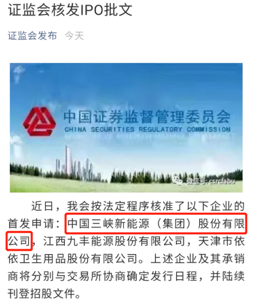 中國儲能網(wǎng)訊:4月23日,經(jīng)中國證監(jiān)會核準(zhǔn),中國長江三峽集團(tuán)有限公司(以下簡稱“三峽集團(tuán)”)旗下中國三峽新能源(集團(tuán))股份有限公司(以下簡稱“三峽新能源”)獲得首次公開發(fā)行股票(IPO)批文,向登陸資本市場邁出關(guān)鍵一步。至此,三峽新能源上市正式進(jìn)入鳴鑼倒計時,迎來高質(zhì)量發(fā)展新機遇。接下來,三峽新能源及其主承銷商將與上海證券交易所協(xié)商確定發(fā)行日程,并刊登招股文件。