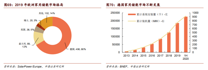 德國是歐洲家用儲能市場領(lǐng)導(dǎo)者,2019 年新增裝機量占比達到 66%。雖然受到新冠疫情影響,德國家用儲能市場在 2020Q1 仍保持較好增勢,累計裝機即將突破1000MW。
