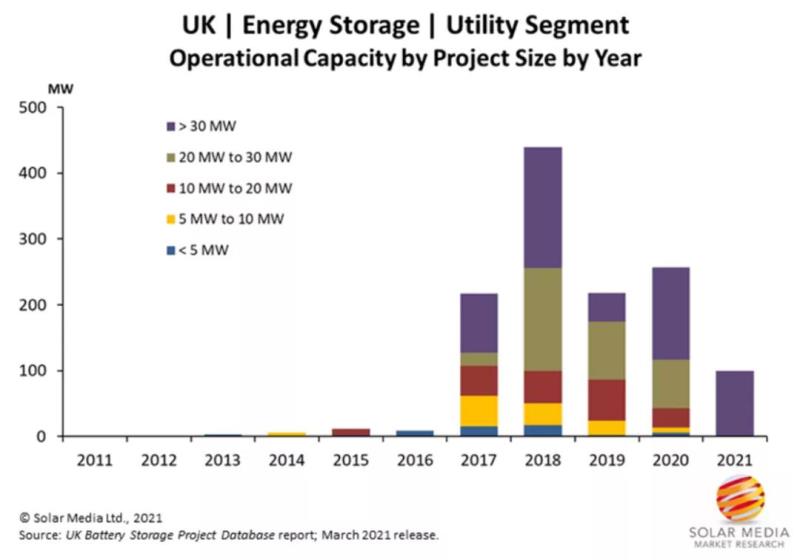 英國公用事業(yè)規(guī)模儲能項目的部署真正始于2017年,隨著EFR項目的成功運行,英國電池儲能市場規(guī)模在2018年達到峰值,隨著市場從單一收入流轉(zhuǎn)向更加靈活的模式,2019年,新增項目的速度有所放緩。