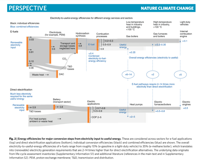 因此,我們應(yīng)該將這些珍貴的氫基燃料優(yōu)先用于它們不可或缺的應(yīng)用領(lǐng)域:長途航空、化工生產(chǎn)原料、鋼鐵生產(chǎn)以及一些可能的高溫工業(yè)過程,因為這些是我們很難直接通電的領(lǐng)域和應(yīng)用。我們目前離100%的可再生能源還很遠,因此有效利用可再生能源是關(guān)鍵。然而,如果我們使用氫基燃料而不是直接電氣化替代品,發(fā)電量需要2到14倍(取決于不同技術(shù)應(yīng)用)。