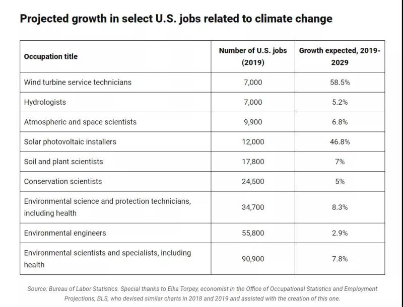 據(jù)美國(guó)勞工統(tǒng)計(jì)局的數(shù)據(jù),預(yù)計(jì)2029年前,一系列與氣候有關(guān)的職業(yè)將快速增長(zhǎng):
