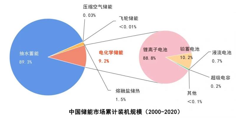 中國能源研究會儲能專委會、中關村儲能產(chǎn)業(yè)技術聯(lián)盟4月下旬發(fā)布的《儲能產(chǎn)業(yè)研究白皮書2021》顯示,截至2020年底,中國已投運儲能項目累計裝機規(guī)模3560萬千瓦,其中,抽水蓄能的累計裝機規(guī)模最大,為3179萬千瓦;電化學儲能的累計裝機規(guī)模位列第二,為326.9萬千瓦,在各類電化學儲能技術中,鋰離子電池的累計裝機規(guī)模最大,為290.2萬千瓦。