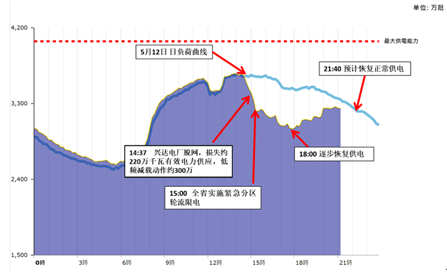 5月13日14時37分,興達電廠因接入345千伏路北變電站母線故障,導致電廠電力送出受阻,兩臺燃煤及兩臺燃氣機組脫網,系統(tǒng)損失有效電力供應約220萬千瓦,造成臺灣系統(tǒng)頻率驟降,為維持電網穩(wěn)定,電力系統(tǒng)在第一時間自動啟動低頻卸載約300萬千瓦。臺電評估短時間內無法立即復電,為維系電力系統(tǒng)安全,自下午3時起執(zhí)行緊急分區(qū)輪流停電,最大限電達到350萬千瓦。后據政府官員稱,計劃在晚21點40分恢復供電。事故過程系統(tǒng)負荷變化曲線下圖所示。