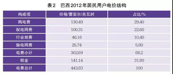 2011年巴西全國(guó)工業(yè)平均電價(jià)為329.0雷亞爾/兆瓦時(shí),而當(dāng)時(shí)巴西以外的27個(gè)主要國(guó)家工業(yè)平均電價(jià)僅為215.5雷亞爾/兆瓦時(shí),以2012年里約熱內(nèi)盧市普通居民用戶(hù)電價(jià)為例(見(jiàn)表2),除稅金外購(gòu)電費(fèi)在電價(jià)中占比最高。