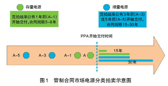 管制合同市場(chǎng)交易機(jī)制。管制合同的簽訂必須通過(guò)專(zhuān)門(mén)的公開(kāi)拍賣(mài)會(huì)進(jìn)行,拍賣(mài)會(huì)由ANEEL授權(quán)和監(jiān)督,CCEE具體組織承辦。圖1中,A為合同交割的年份,已投產(chǎn)的存量電源拍賣(mài)通常在合同交割前的1年(A-1)舉行,需新建的增量電源拍賣(mài)通常在合同交割前3~5年舉行。可以看出,A-1拍賣(mài)會(huì)是配電商申報(bào)負(fù)荷需求的最后一個(gè)時(shí)間窗口,如果A-1拍賣(mài)會(huì)上的投標(biāo)發(fā)電商總發(fā)電量低于配電商申報(bào)總量時(shí)的情況,則配電商會(huì)陷入“欠采購(gòu)”狀態(tài)。