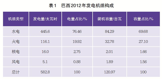 2012年巴西全國(guó)發(fā)電總量552.5太瓦時(shí),發(fā)電裝機(jī)容量121.0吉瓦,發(fā)電量和總裝機(jī)的類(lèi)型構(gòu)成如表1所示。