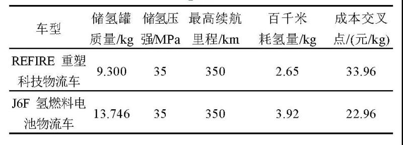 氫能若要作為一種新興能源被普遍接受,并在未來能源結(jié)構(gòu)中占有一席之地,成本因素始終是起決定性作用的。在全球范圍內(nèi),氫產(chǎn)業(yè)鏈在現(xiàn)階段尚不成熟,特別是氫氣的使用價(jià)格較高,成本仍制約著氫能長期發(fā)展。以物流車這一國內(nèi)氫燃料電池汽車的典型場景為例,選取當(dāng)下熱門的2種氫燃料電池物流車型與傳統(tǒng)柴油物流車進(jìn)行對比,2種氫燃料電池物流車型的最大載重為3t,而市場上載重3t的柴油物流車百千米耗油量大概在15L,2種氫燃料電池物流車的參數(shù)見表3。參考當(dāng)前市場價(jià)格,假設(shè)0號柴油為6元/L,得出氫氣與柴油的使用成本交叉點(diǎn)。根據(jù)測算,使用成本交叉點(diǎn)應(yīng)在30元/kg以下,即氫氣售價(jià)在此價(jià)格以下才能在市場上占據(jù)優(yōu)勢,而目前國內(nèi)加氫站售價(jià)為60~80元/kg。因此,如何降低氫氣供應(yīng)成本是當(dāng)下產(chǎn)業(yè)發(fā)展無法回避的問題。