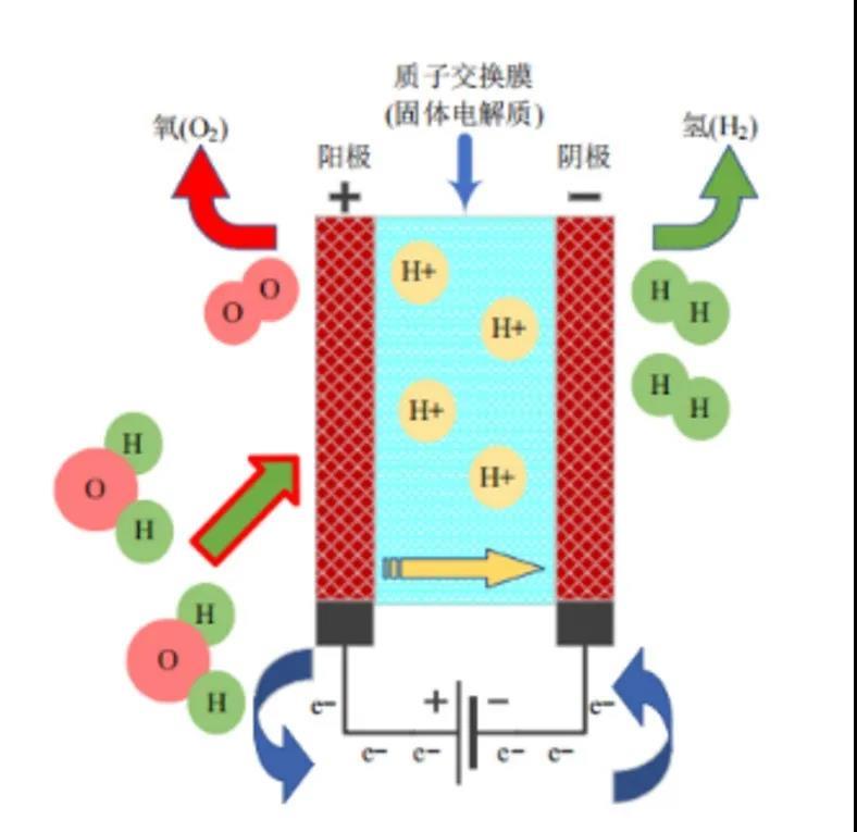 典型的PEM水電解池主要部件包括陰陽極端板、陰陽極氣體擴(kuò)散層、陰陽極催化層和質(zhì)子交換膜等。其中:陰陽極端板起固定電解池組件,引導(dǎo)電的傳遞與水、氣分配等作用;陰陽極氣體擴(kuò)散層起集流和促進(jìn)氣液的傳遞等作用;陰陽極催化層的核心是由催化劑、電子傳導(dǎo)介質(zhì)、質(zhì)子傳導(dǎo)介質(zhì)構(gòu)成的三相界面,是電化學(xué)反應(yīng)發(fā)生的核心場所;質(zhì)子交換膜作為固體電解質(zhì),一般使用全氟磺酸膜,起到隔絕陰陽極生成氣、阻止電子傳遞的同時(shí)傳遞質(zhì)子的作用。目前,常用的質(zhì)子交換膜主要來自DuPont、AsahiGlass、AsahiChemicalIndustry、Tokuyama等公司。