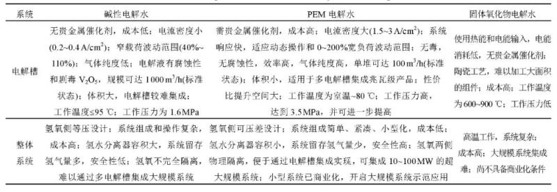 根據(jù)電解質(zhì)系統(tǒng)的差別,可將電解水制氫分為堿性電解水、質(zhì)子交換膜(PEM)電解水和固體氧化物電解水3種。三者的基本原理是一致的,即在氧化還原反應(yīng)過程中,阻止電子的自由交換,而將電荷轉(zhuǎn)移過程分解為外電路的電子傳遞和內(nèi)電路的離子傳遞,從而實(shí)現(xiàn)氫氣的產(chǎn)生和利用。但三者的電極材料和電解反應(yīng)條件不同,其技術(shù)比較如表1所示。
