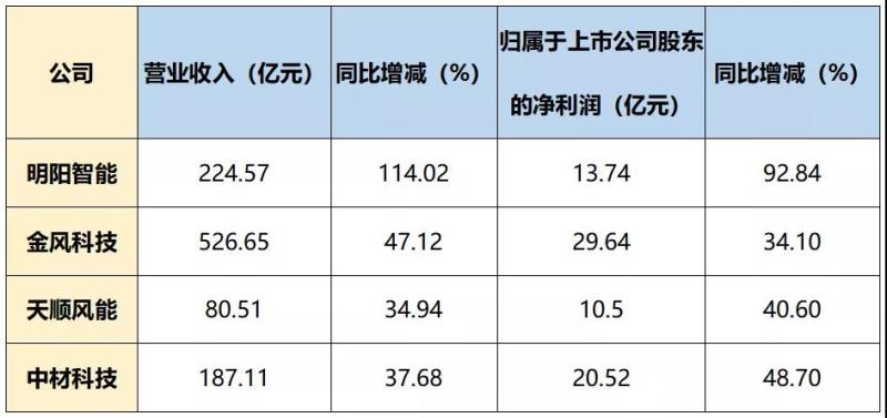 從風電主要上市公司業(yè)績表現(xiàn)來看,明陽智能、金風科技、天順風能、中材科技四家公司的營業(yè)收入和歸母凈利潤同比增加。其中明陽智能營業(yè)收入增幅最大,為114.02%,歸母凈利潤同比增加92.84%。