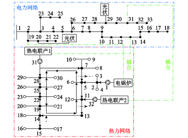 然后,提出以經(jīng)濟(jì)性和環(huán)保性為目標(biāo)的多元儲(chǔ)能配置模型,采用改進(jìn)遺傳算法+Gurobi求解器的混合策略求解。最后,將所提方法應(yīng)用于改進(jìn)IEEE 33節(jié)點(diǎn)配電與45節(jié)點(diǎn)熱網(wǎng)耦合系統(tǒng)算例。結(jié)果表明多元儲(chǔ)能協(xié)同配置的優(yōu)越性,以及考慮多元儲(chǔ)能差異性對(duì)儲(chǔ)能配置的積極影響。其得出的結(jié)論如下: